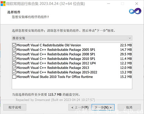 Microsoft Visual C++ Redistributable(简称MSVC,VB/VC,系统运行库)是Windows操作系统应用程序的基础类型库组件。此版Visual C++运行库组件合集(微软常用运行库合集)由国内封装爱好者@Dreamcast打包而成,整合Visual C ++组件安装包运行库所有版本,提供图形安装界面,可自选更新VC++版本。
