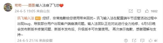 讯飞输入法官方回应称:讯飞输入法在配置端午节运营活动过程中出现 Bug,导致部分用户出现客户端崩溃问题。