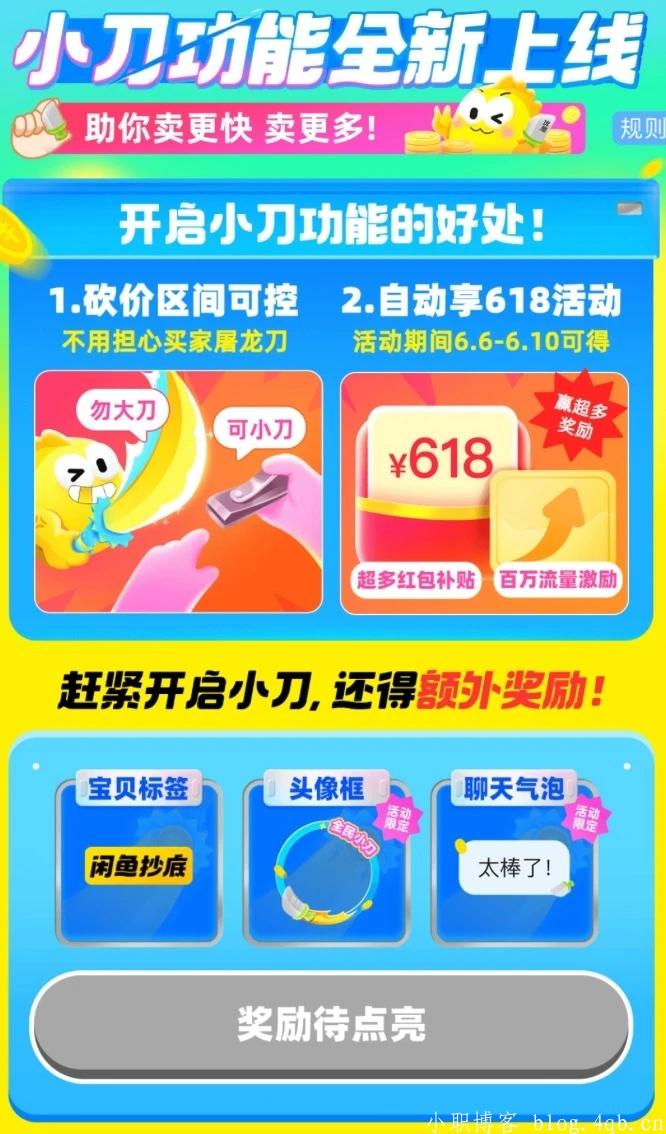 6 月 2 日消息,闲鱼 App 上线商品“小刀功能”闲鱼 App 上线商品“小刀功能”,用户可以商品编辑页面中设置相关信息,号称“不用担心买家屠龙刀”,官方描述称“卖家可在商品目录中设置小刀优惠金额上限,买家下单前可通过小刀游戏随机获取优惠金额”,相关“小刀优惠”有效期为 24 小时,号称可以“有效促进买家尽快下单”。