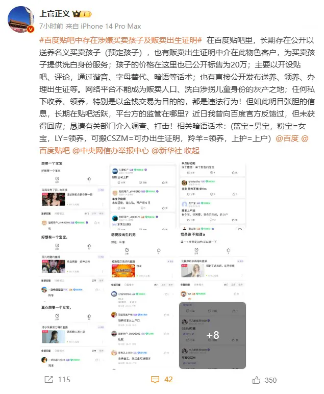 5 月 28 日消息,打拐志愿者 @上官正义 在微博发文称,在百度贴吧里,长期存在公开以送养名义买卖孩子(预定孩子),也有贩卖出生证明中介在此物色客户,为买卖孩子提供洗白身份服务。