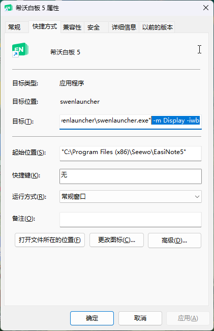 只需复制一份希沃白板5的快捷方式,右键「属性」→「快捷方式」选项卡→「目标(T):」的最后面加上“ -m Display -iwb”(即启动参数,如下图所示),在「常规」选项卡内重命名个顺眼的名字,如“希沃白板5(大板模式)”,点击「确定」即可保存修改