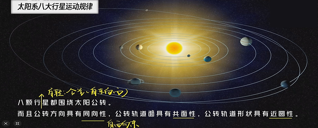 普通性:从运动规律看,八大行星有同向性、共面性、近圆性的特点,从八大行星分类看类地行星有相似的特征,地球只是太阳系中一颗普通的行星。——绕日公转有一定规律、类地行星物理性质相似