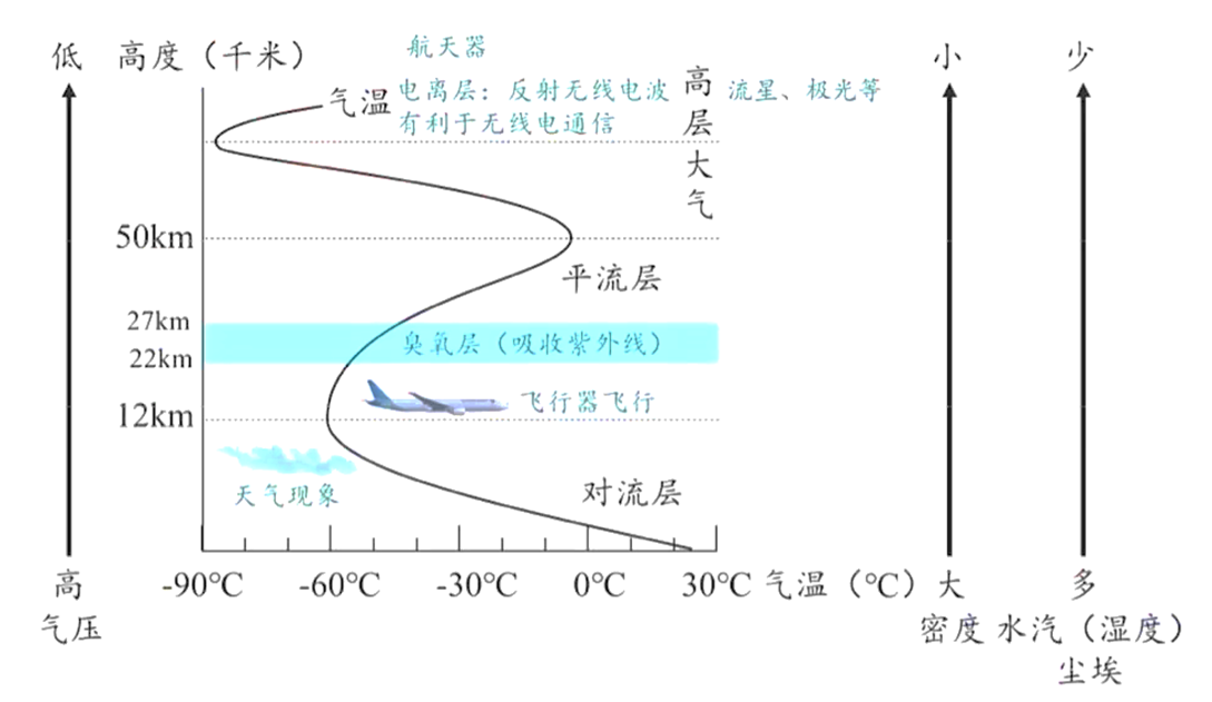 口诀:对流层大气,热量吸大地;天气变化多,水汽很充裕;平流臭氧多,吸短波辐射;飞机贼平稳,海拔高变热