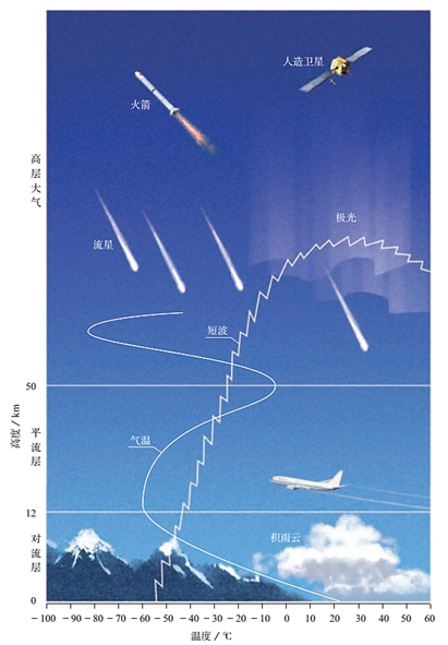地球大气从地面向上,可延伸到数千千米高空。根据温度、运动状况和密度,大气自下而上可以划分为对流层、平流层和高层大气。