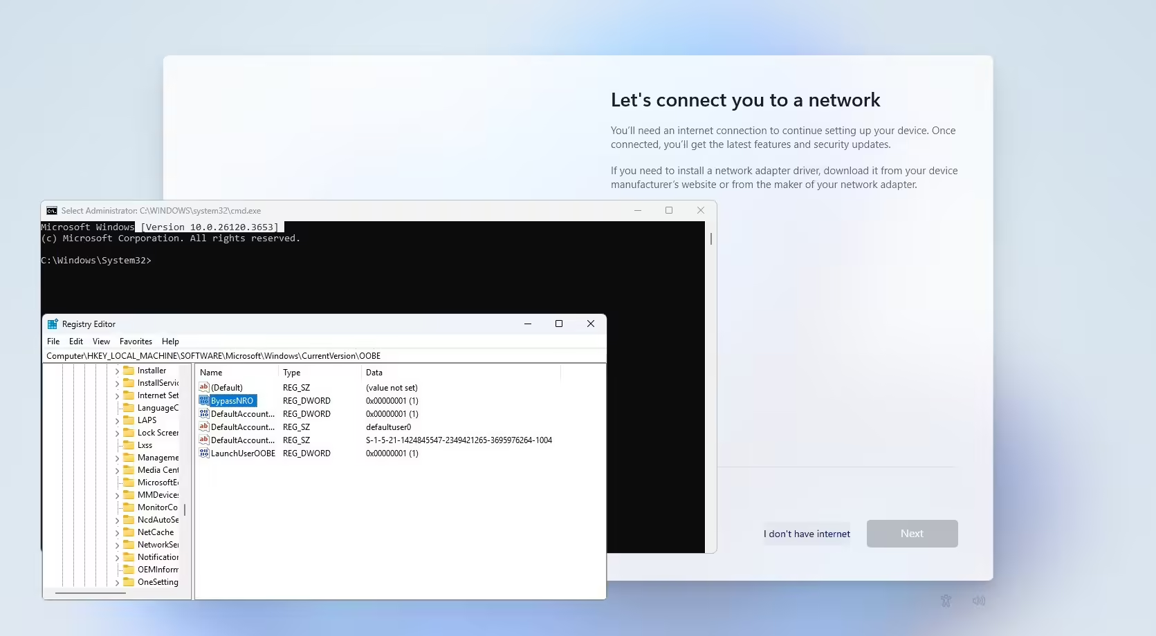 reg add HKLMSOFTWAREMicrosoftWindowsCurrentVersionOOBE /v BypassNRO /t REG_DWORD /d 1 /f